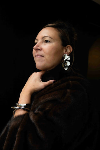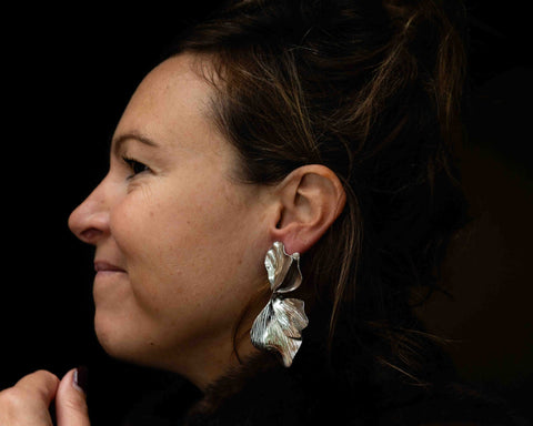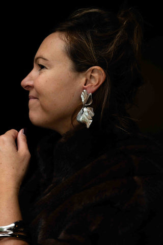 Deze zilverkleurige statement oorbellen zijn een waar kunstwerk. Met hun organische, bloemachtige vorm en verfijnde reliëfstructuur stralen ze pure elegantie uit.